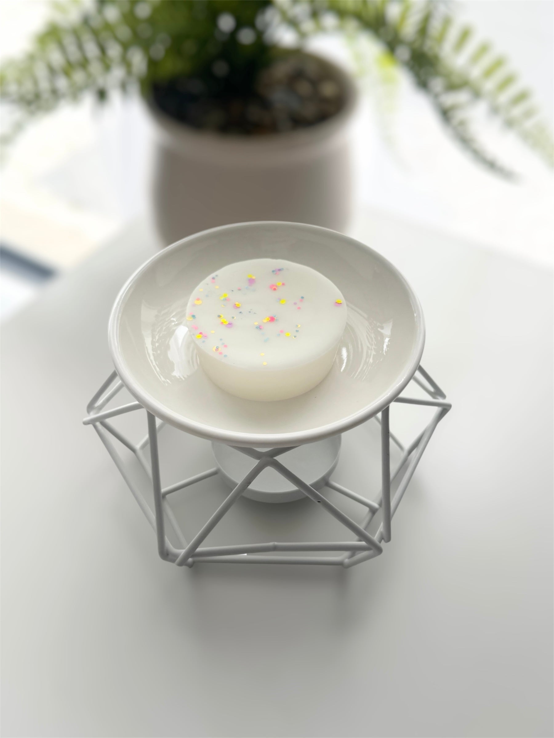 Our Hex Wax Melt Burner features a sleek geometric frame with a smooth ceramic dish — the perfect mix of style and function. Add your favourite wax melt, light a tealight below, and let your space fill with the scent you love most.